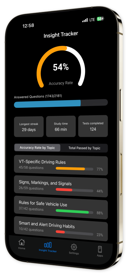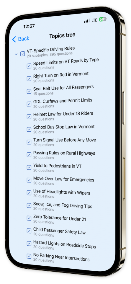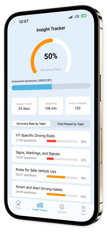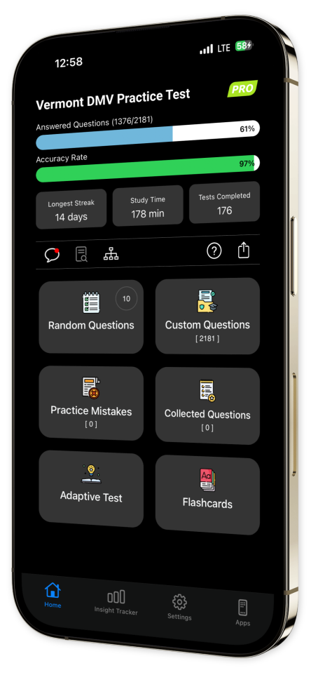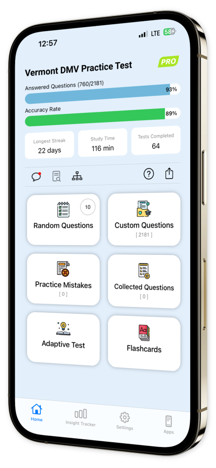 Ace your Vermont driving test with the Vermont DMV Practice Test app! Our comprehensive tool is meticulously crafted to simulate the actual DMV test environment, providing you with an extensive array of practice questions essential for your driver's license journey.